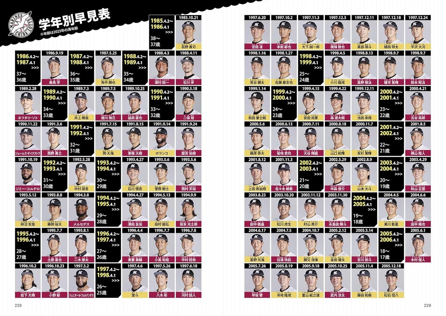 育成選手を含むマリーンズの全選手が選手1名につき、2ページに渡って紹介されています。